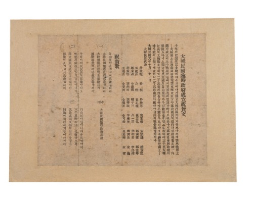 「대한민국임시정부 성립 축하문과 선언서」는 1919년 3·1 만세운동(이하 ‘3·1운동’) 이후 상하이에서 수립된 대한민국임시정부가 같은 해 9월, 국내의 ‘한성정부’, 연해주의 ‘대한국민의회’와 통합되어 ‘대한민국임시정부’로 출범한 것을 기념하고 제2차 독립시위운동을 촉구하고자 대한민족대표 30인의 이름으로 10월 31일 발행된 활판 인쇄 전단지이다.