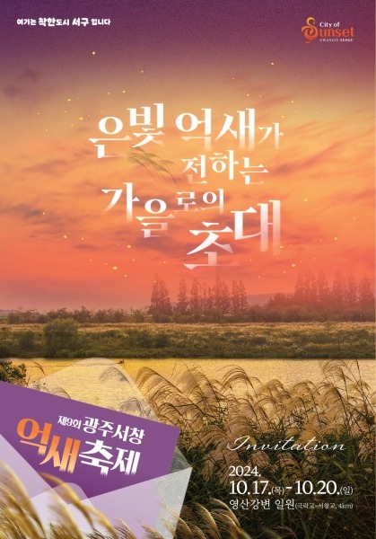 이번 축제는 ‘은빛 억새가 전하는 가을로의 초대’를 주제로 극락교에서 서창교에서 이르는 억새길 4㎞ 구간을 축제장으로 꾸민다. 특히 서구는 개‧폐막식을 비롯해 축제 전반에 관광브랜드인 ‘노을&선율이 머무는 도시’의 의미와 이미지를 적극 반영했다.