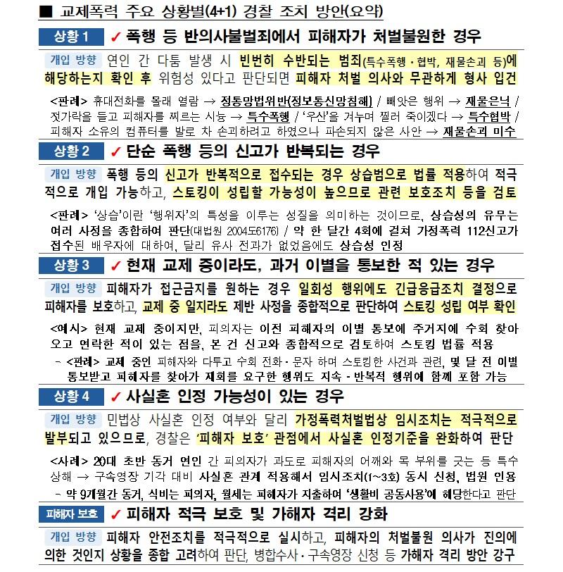경찰청 관계자는 “해당 지침은 연인 간 단순 말다툼이나 폭력 발생 때 경찰의 적극적 개입 가능성을 검토한 자료로, 교제폭력 범죄에 대한 엄정 대응 의지를 담아 제작했다”고 설명했다.