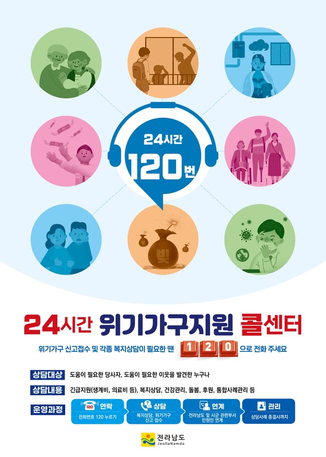 도민이 주변 생활이 어렵거나 도움이 필요한 취약계층을 발견하면 전남도 위기가구지원 콜센터(120번), 복지위기알림 앱을 통해 손쉽게 신고할 수 있다.