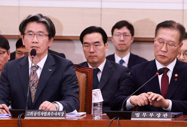 오동운 공수처장은 이날 법사위에서 "이 사건(비상계엄 사태)과 관련해 김건희에 대해서는 출국금지 조치 수사 지휘를 안 했나. 윤석열 부부잖아요"라는 정청래 법제사법위원장의 질문에 "검토하겠습니다"고 답했다.