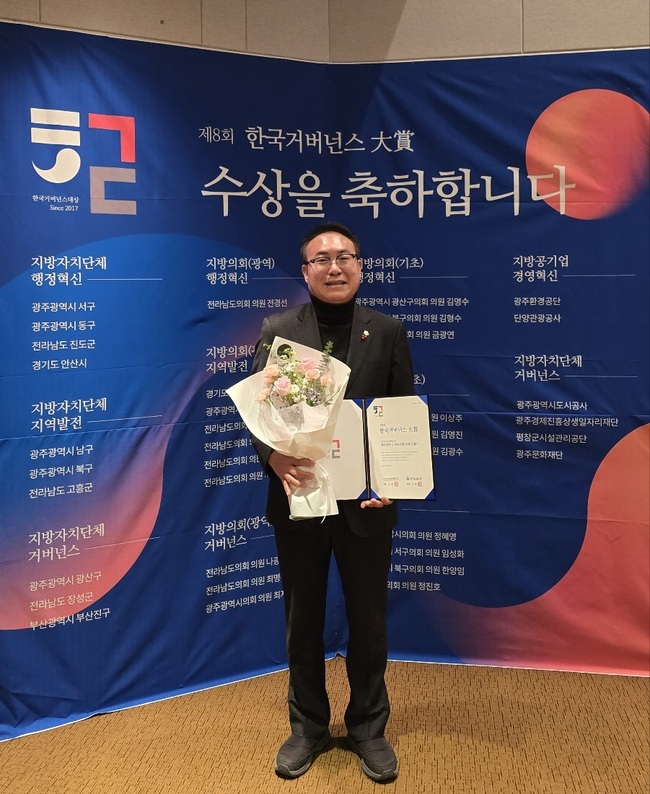 ‘한국거버넌스 대상’은 한국거버넌스학회와 무등일보가 공동 주관하며, 참신한 의정활동을 통해 풀뿌리 민주주의를 실현하고 지역사회 발전에 공헌한 광역ㆍ기초의원들에게 수여하는 상이다.