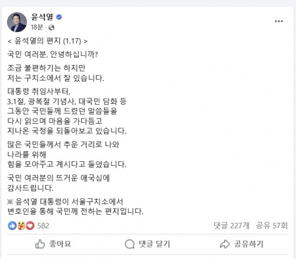 윤석열 대통령이 17일, 서울구치소에서 지지자들에게 옥중 메시지를 전달했다. 구금 상태에서 공개된 첫 메시지다.