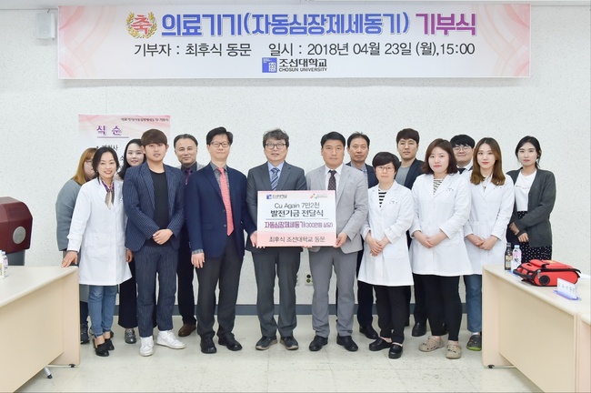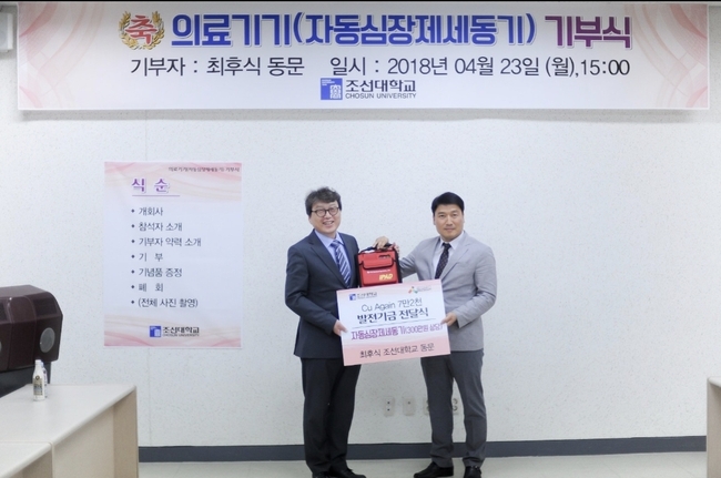 최후식 조선대학교 동문은 지난 23일 조선대학교 보건진료소에서 열린 '의료기기(자동심장제세동기) 기부식'에서 300만원 상당의 자동심장제세동기를 전달했다.