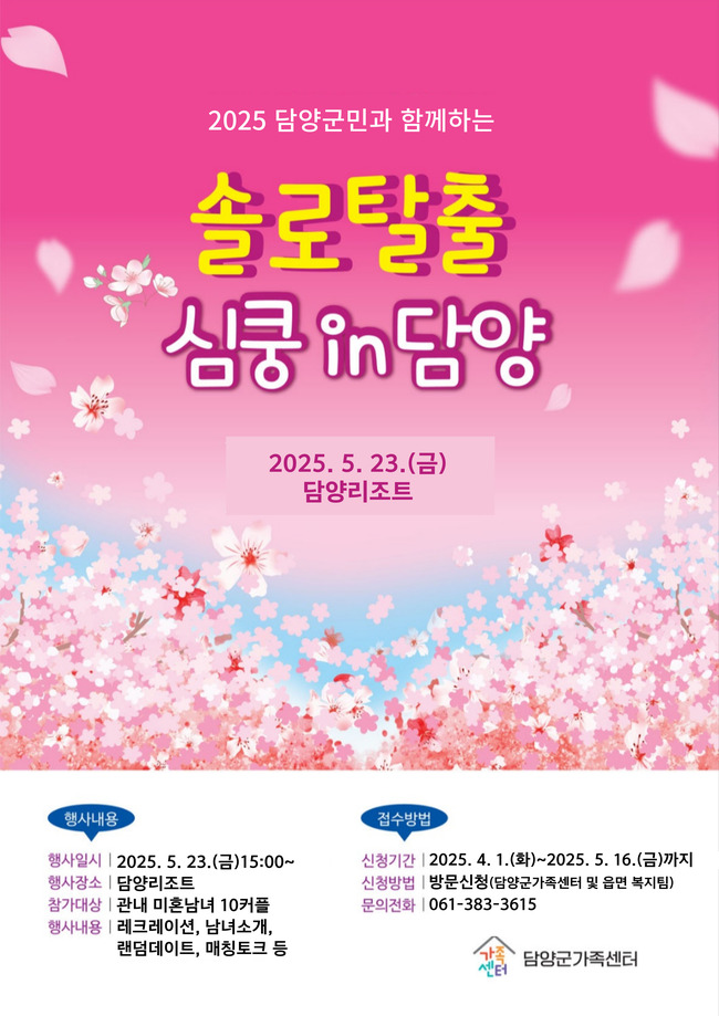 지난해 『솔로탈출Ⅰ』이 빅히트를 치면서 큰 호평을 받아 2025년에도 추진하게 된 청춘한마당 『솔로탈출Ⅱ, 심쿵 in 담양』은 저출산·고령화로 인한 인구소멸 대응을 위하여 2024년 담양군과 함께하는 담양군가족센터의 ′가족수 늘리기′ 특수시책으로, 첫 해에는 12쌍의 미혼남녀 만남에서 4쌍의 커플이 탄생했고, 그중에서 3쌍이 결혼까지 성사되고 있는 중으로 담양군에서는 가을 쯤, 전통혼례식을 지원할 예정이다.