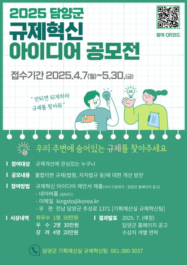 담양군은 군민의 일상생활과 기업 경제활동에 걸림돌이 되는 불합리한 규제를 개선하기 위해 '2025년 담양군 규제혁신 아이디어 공모전'을 개최한다고 밝혔다.
