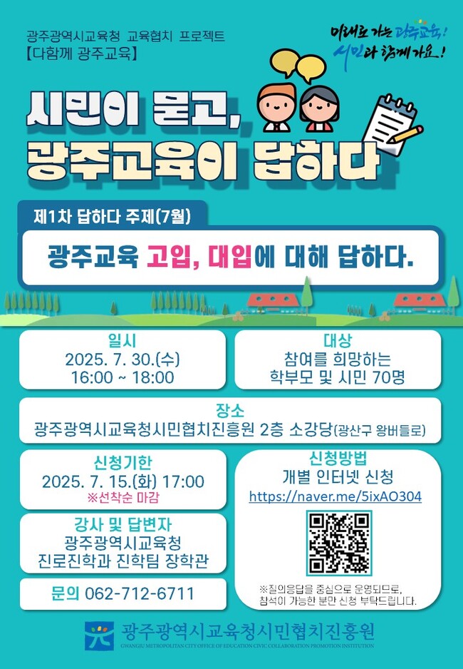 참여 대상은 광주교육에 관심 있는 학부모, 시민 등 선착순 70명이다. 참여 신청은 오는 15일 오후 5시까지 온라인(https://naver.me/5ixAO304)으로 하면 된다.