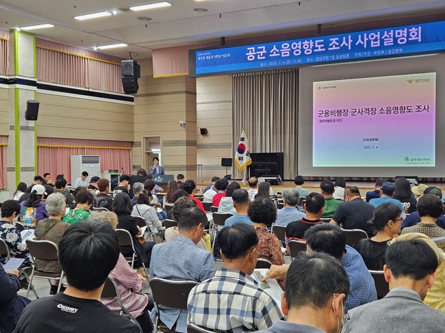국방부가 주최하고, 공군본부가 주관한 이날 설명회는 올해 1월부터 내년 12월까지 진행되는 ‘군 소음영향도 조사’의 절차, 방법, 일정 등을 주민에게 알리고, 의견을 수렴하기 위해 마련됐다. 조사는 전문 용역기관이 수행한다.