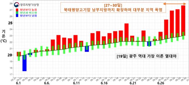 또한, 27일 첫 폭염특보가 발효되어 28일 전 지역으로 확대된 가운데, 29∼30일에는 광주․전남 일평균기온 1위(각 해당일 기준)를 기록하는 등 한여름 날씨를 보이며 매우 무더웠다.