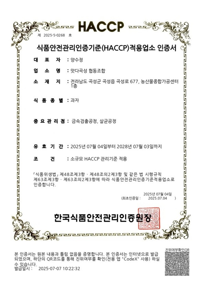 HACCP은 식품의 생산부터 소비까지 전 과정에서 발생할 수 있는 위해요소를 사전에 분석하고, 이를 중점적으로 관리하여 식품의 안전성을 확보하는 과학적 위생관리 체계이며, 이번에 인증을 받은 품목은 ▲과자류 ▲떡류 ▲곡류가공품 ▲기타 가공품 ▲잼 등 총 5개 유형으로, 인증 유효기간은 2025년 7월 4일부터 2028년 7월 3일까지 3년간이다.