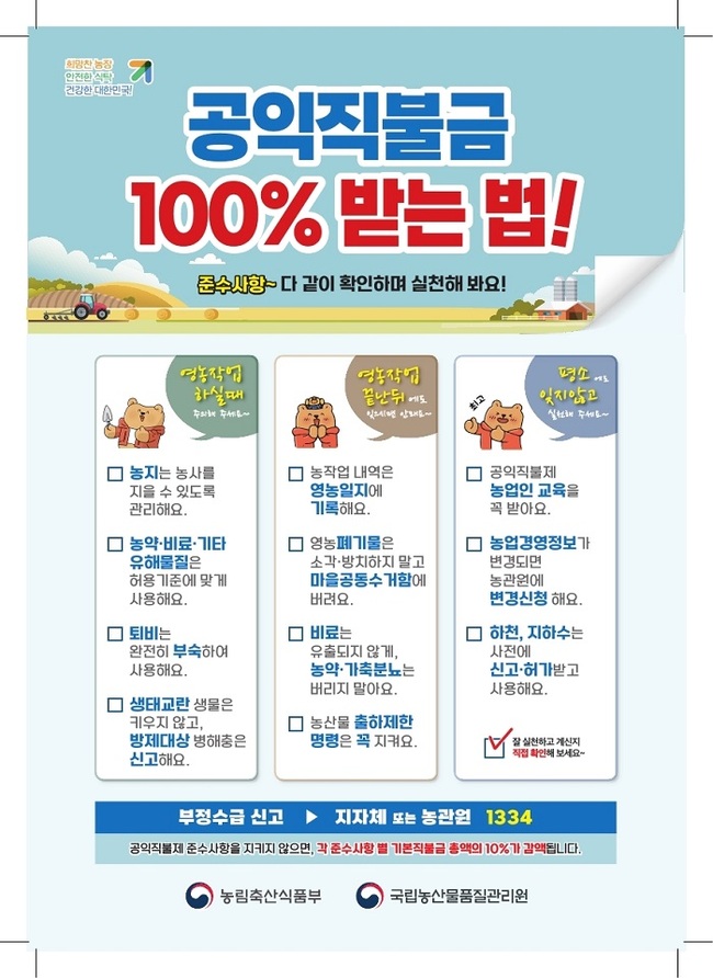 기본형 공익직불제는 농업·농촌의 공익적 기능을 증진하고 농업인의 소득 안정을 도모하기 위한 제도로, 직불금을 100% 받기 위해서는 법령에서 정한 16가지 준수사항을 모두 이행해야 한다.