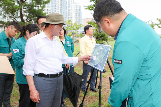 정 시장은 우수기 대비 토사 유출 등 안전 우려가 없는지 공사 현장을 점검한 뒤, 관계 부서로부터 사업 추진 현황을 보고받았다.