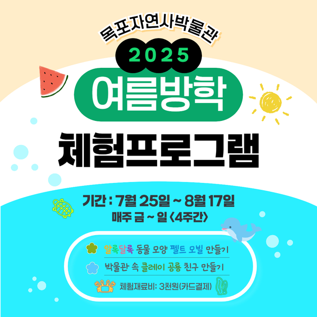 목포시는 목포자연사박물관이 여름방학 성수기를 맞아 어린이와 가족이 함께 즐길 수 있는 ‘알록달록 다채로운 여름방학 체험교실’을 운영한다고 알렸다.
