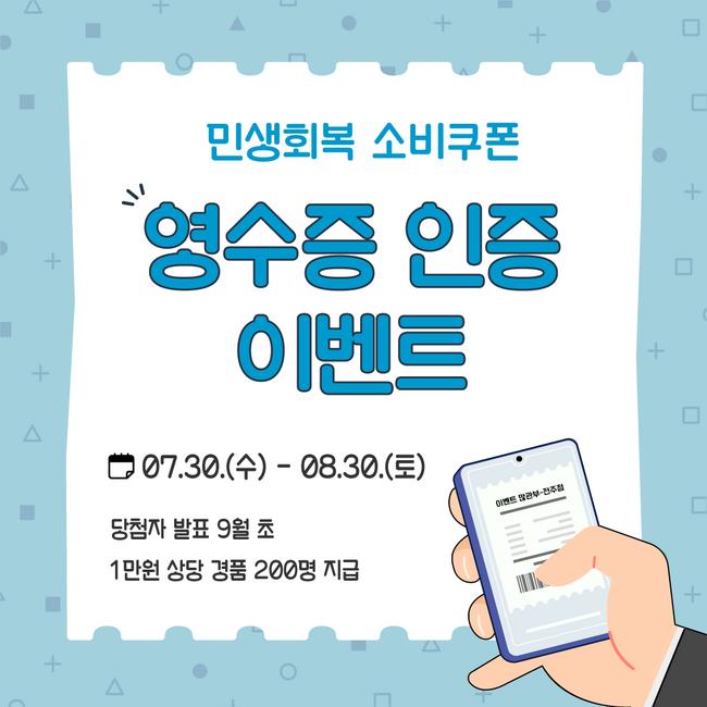 전북특별자치도가 민생경제 회복과 지역상권 활성화를 위해 추진 중인 ‘민생회복 소비쿠폰’ 사용을 촉진하기 위해 오는 30일까지 ‘영수증 인증 이벤트’를 실시한다고 밝혔다.