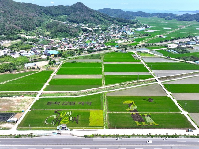 약 3개월이 흐른 현재, 키가 자라고 색이 뚜렷해진 유색벼들은 순천시 문화 산업을 알리는 슬로건과 순천시 CI로고를 새겼다.