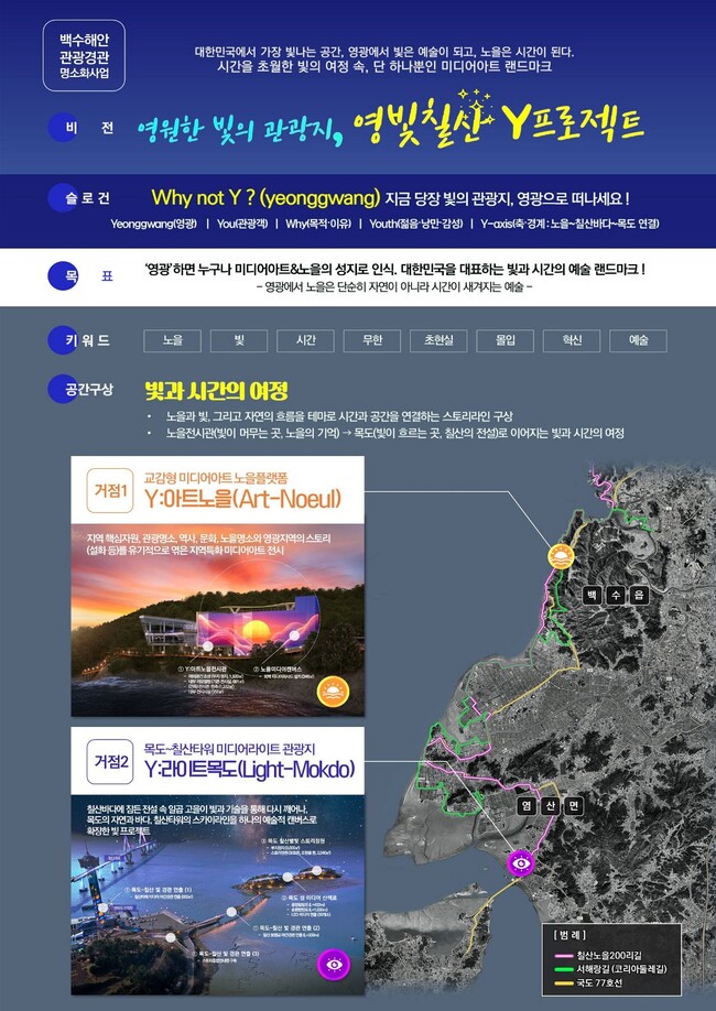 사업내용은 백수해안도로를 중심으로 경관자원과 문화콘텐츠를 집약·강화하는 사업으로 ▲해안 경관 인프라 확충 ▲노을전시관 리모델링 및 미디어파사드 조성 ▲칠산타워와 목도를 잇는 미디어라이트 연출 등을 통해 영광군을 체류형 관광도시로 탈바꿈시키는 것을 목표로 한다.