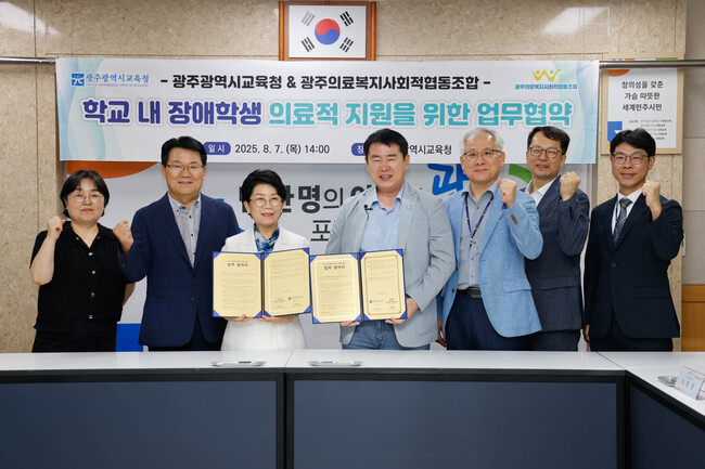 광주시교육청과 광주의료복지사회적협동조합은 지난 7일 ‘학교 내 장애학생 의료적 지원을 위한 업무협약’을 체결했다고 밝혔다.