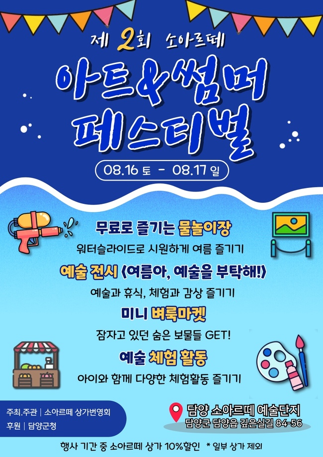 ‘소아르떼’ 상가번영회가 주최·주관하고 담양군이 후원하는 이번 행사는 방학을 맞은 가족 관광객과 지역민이 함께 즐길 수 있도록 무료 물놀이장, ‘여름아, 예술을 부탁해!’ 전시, 벼룩시장, 다양한 예술 체험으로 구성됐다.
