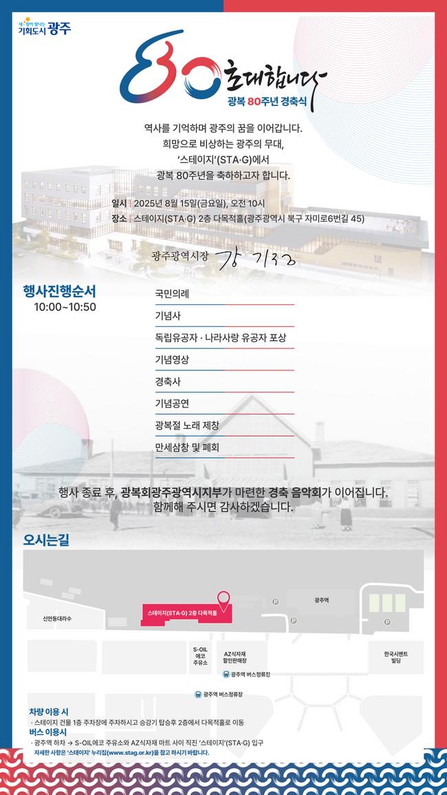 정원석 자치행정국장은 “제80주년 광복절을 맞아 국권회복을 경축하고, 광복을 위해 헌신하신 분들을 기리는 자리에 많은 시민이 함께하길 바란다”며 “광주의 과거와 미래를 잇는 무대가 될 수 있도록 많은 관심과 참여를 부탁드리며, 각 가정에서도 태극기를 달아 경축 분위기를 함께해 달라”고 말했다.
