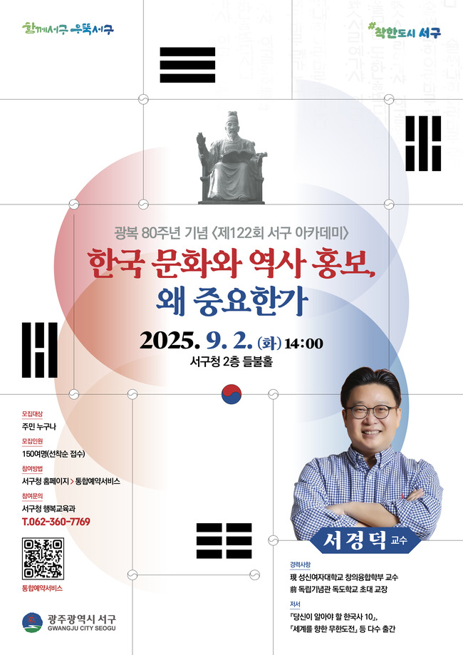 서구는 광복 80주년을 기념해 서경덕 성신여자대학교 교수 초청 제122회 서구 아카데미를 개최한다.