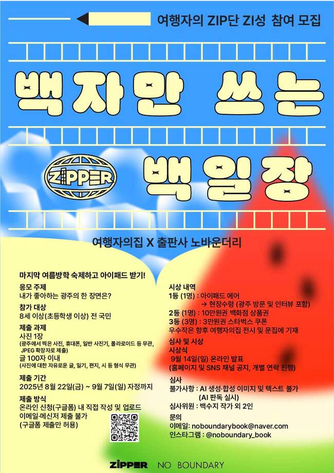 심사는 로컬 크리에이터 노바운더리 백수지 작가를 포함한 3인 위원단이 맡고, 시상은 다음달 14일 ‘여행자의 ZIP’ SNS를 통해 발표될 예정이다.
