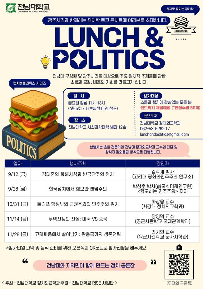 전남대에 따르면 정치학 토크 콘서트 ‘런치&폴리틱스(Lunch&Politics)’ 시리즈가 2025년 가을학기(9월~11월) 동안 총 5회에 걸쳐 열린다.