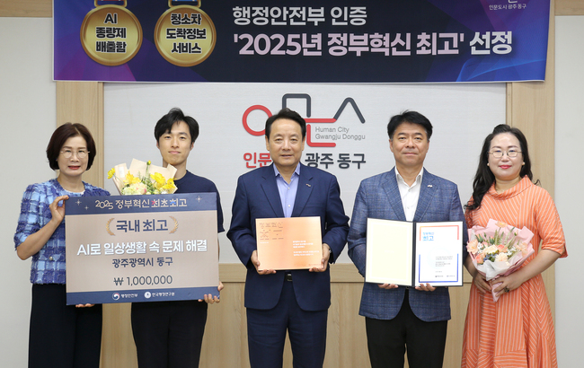 동구는 행정안전부 주관 2025 정부혁신 최초·최고 공모에서 ‘전국 최고’ 기관으로 선정, 인증패를 받았다고 밝혔다.