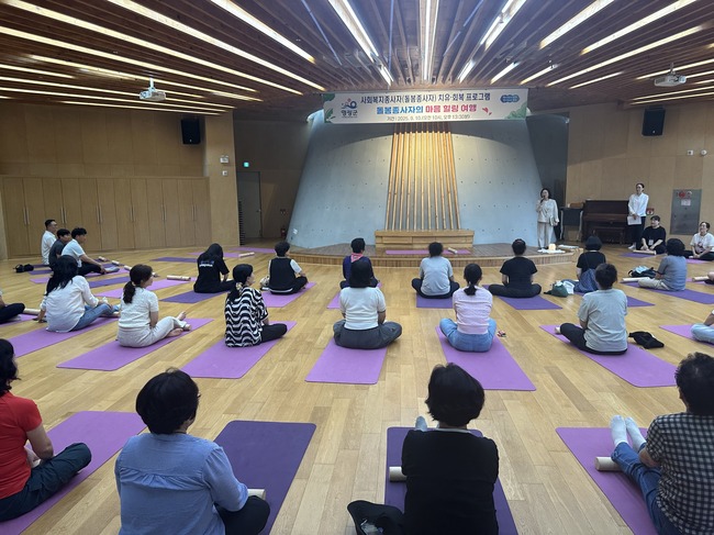 ‘돌봄종사자의 마음 힐링 여행’을 주제로 진행된 이날 행사에서는 굴림대 명상, 요가명상, 나만의 감성 향수 만들기 등 다양한 체험이 마련돼 참가자들은 바쁜 일상에서 잠시 마음을 내려놓고 정서적 안정을 되찾으며 활력을 충전하는 뜻깊은 시간을 보냈다.