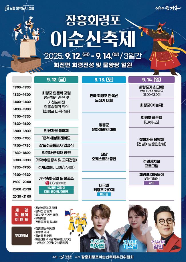 장흥군은 오늘부터 14일까지 3일간, 장흥군 회진면 회령진성 및 회진항 물양장 일원에서 2025 장흥 회령포 이순신 축제를 개최한다고 밝혔다.