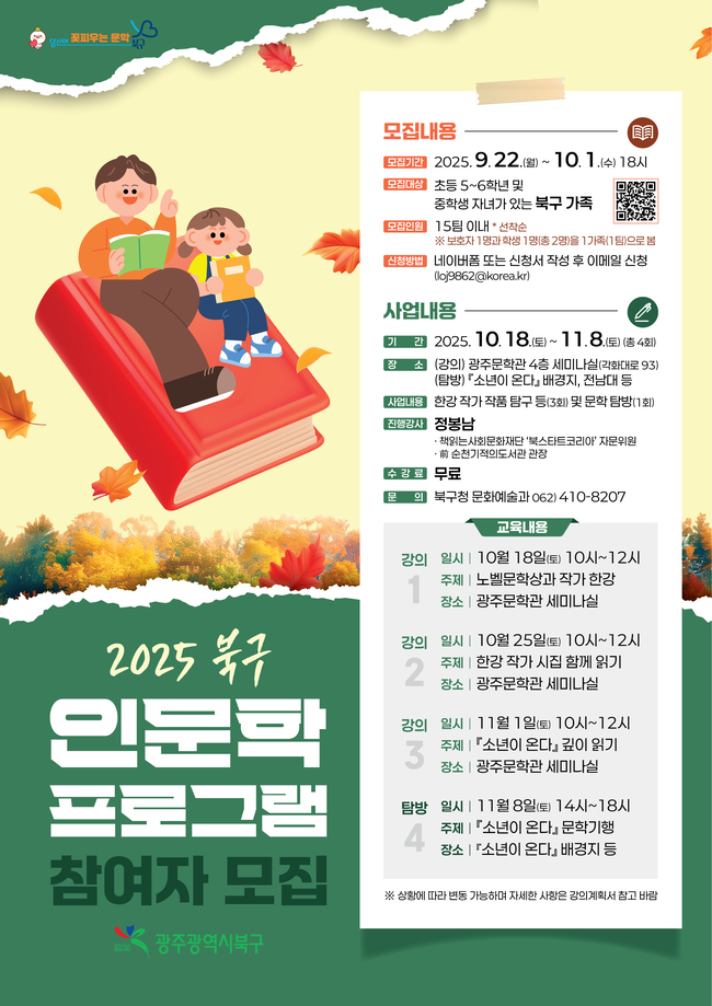 문인 북구청장은 “이번 프로그램이 문학을 읽고 사유하며 인문학의 소중한 가치를 체감하는 계기가 되기를 바란다”며 “앞으로도 문화 향유 기회 확대를 위해 체감도 높은 정책을 펼쳐 나가겠다”고 말했다.