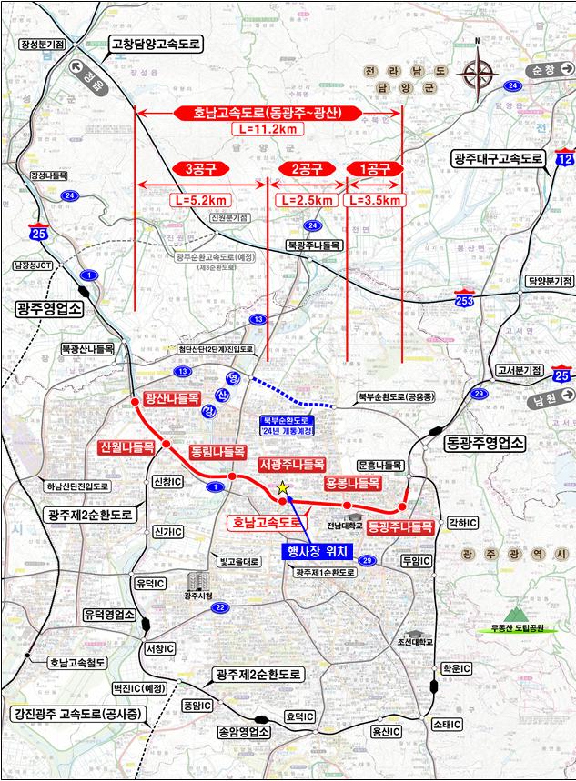 호남고속도로 동광주나들목~광산나들목 구간이 기존 4차로에서 6~8차로로 확장된다. 이는 1986년 4차로로 확장된 이후 25년 만에 추진되는 대규모로 도로 확장 공사이다.