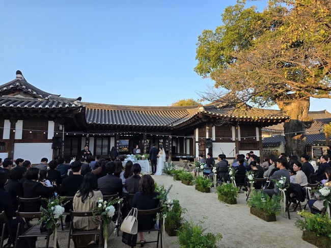 전통문화유산인 목사내아에서 열린 3호 커플의 예식은 맑은 가을 햇살과 단풍이 어우러진 가운데 한옥의 고즈넉한 정취와 예식을 축하하는 꽃길이 조화를 이루며 신랑 신부와 하객 모두에게 잊지 못할 감동을 선사했다.