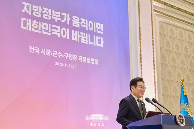 이재명 대통령은 지난 12일 청와대 영빈관에서 161명의 시장·군수·구청장이 참석한 국정설명회를 주재하며 지방정부가 행정의 중심이라는 점을 강조하고 지역 현안 건의를 직접 청취하며 국정 운영 방향을 공유했다.