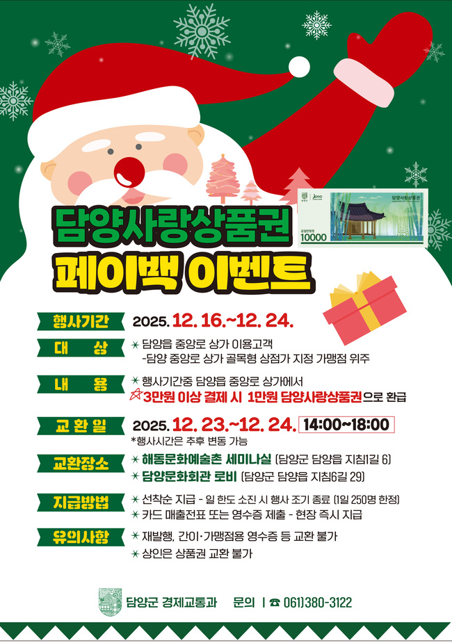 담양군은 연말 소비 진작과 지역 상권 활성화를 위해 오는 23일부터 25일까지 담양읍 중앙로와 담양시장 일원에서 ‘담양사랑상품권 페이백 행사’를 운영한다고 밝혔다.