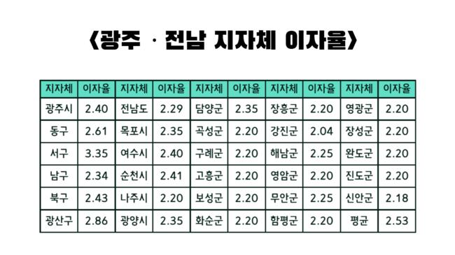 여수시(2.40%), 목포시·광양시(2.35%), 무안군·해남군(2.25%)이 뒤를 이었으며 다른 시군은 2.20% 안팎의 금리를 기록했다.