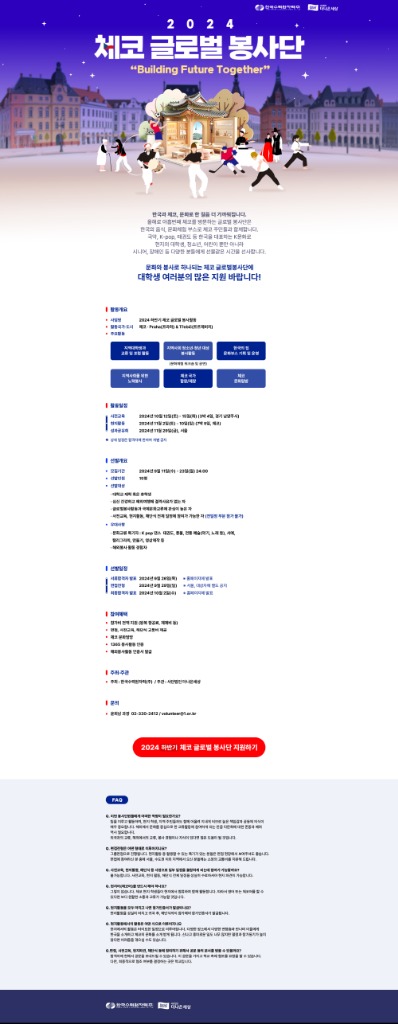 체코 글로벌 봉사단은 올해에만 2번째 파견 예정으로, 교육봉사, 문화교류 등의 활동뿐만 아니라 현지 대학교를 방문해 한국-체코 대학생들이 함께 워크숍도 개최할 예정이다.