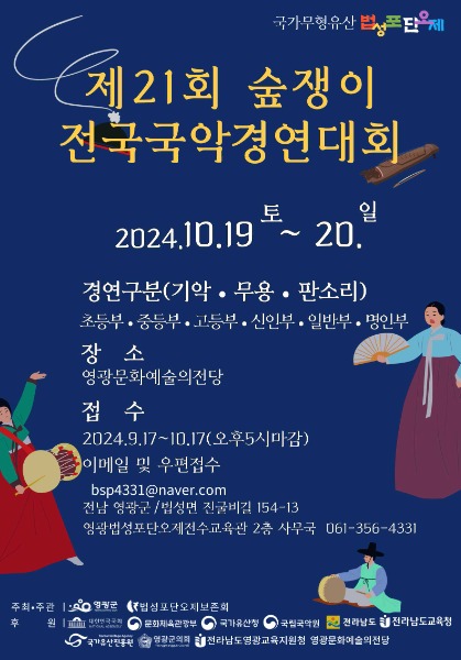 제21회 숲쟁이 전국 국악경연대회가 오는 10월 19일부터 20일까지 영광문화예술의전당에서 예선과 본선이 진행된다.