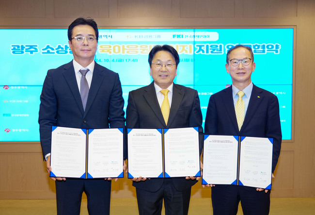광주광역시는 KB금융그룹, 한국경제인협회(한경협)와 함께 지난 4일 오후 시청 비즈니스룸에서 광주 소상공인의 출산과 육아를 돕는 ‘광주 소상공인 육아응원패키지 지원 업무협약’을 체결했다.