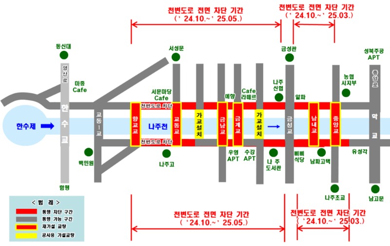 나주시는 나주천 생태물길 복원 사업 공사로 10월 4일부터 나주고등학교에서 농협 나주시지부 건물 구간 천변도로 차량 통행을 전면 통제한다고 지난달 30일 밝혔다.