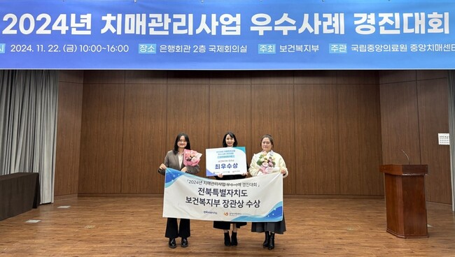 전북특별자치도는 지난 22일 보건복지부가 주최한 ‘2024년 치매관리사업 전국 우수사례 경진대회’에서 전북특별자치도광역치매센터의 ‘맞춤형 사례관리 담당자 역량 향상 프로젝트’가 우수사례로 선정돼 보건복지부장관 최우수상을 수상했다.