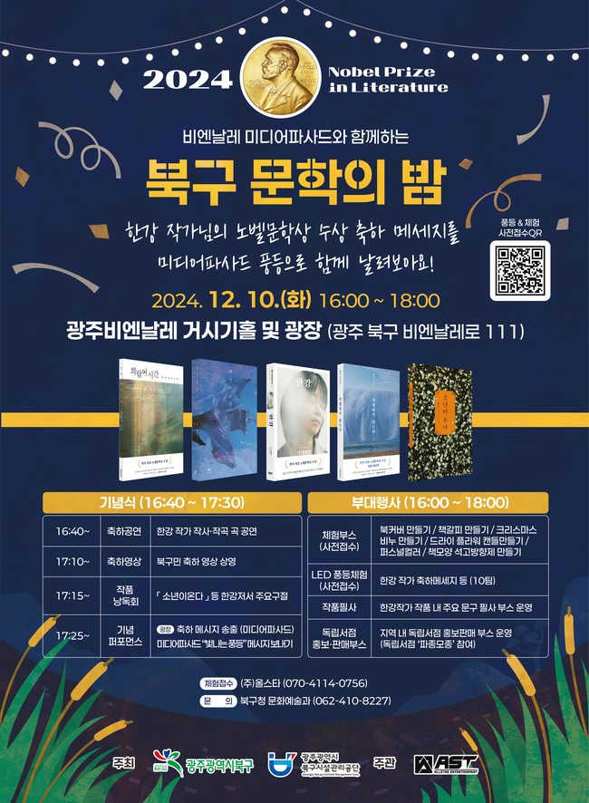 한편 문학의 밤 행사와 더불어 같은 날 ‘중흥도서관’에서는 ▲이희재 번역가의 한국 문학 속 빛나는 번역 특별강연 ▲체험 프로그램(‘노벨문학상 수상 기념 메달 키링 만들기’, ‘한강 관련 키워드 십자말 퍼즐 풀기’) ▲역대 노벨문학상 수상 작가 도서 전시전 등 ‘한강의 문학, 세계의 빛이 되다’ 주제로 축하 행사가 열린다.