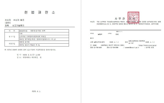헌재는 1일 취재진에 "대통령 윤석열 탄핵 사건에 대한 선고가 4월 4일 오전 11시 대심판정에서 있을 예정"이라고 밝혔다.