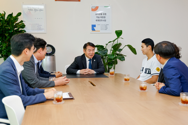 이정선 교육감은 지난 5일 교육감실에서 미국 야구 메이저리그 텍사스 레인저스에 입단한 광주제일고 김성준 선수를 만나 응원 메시지를 전달했다.