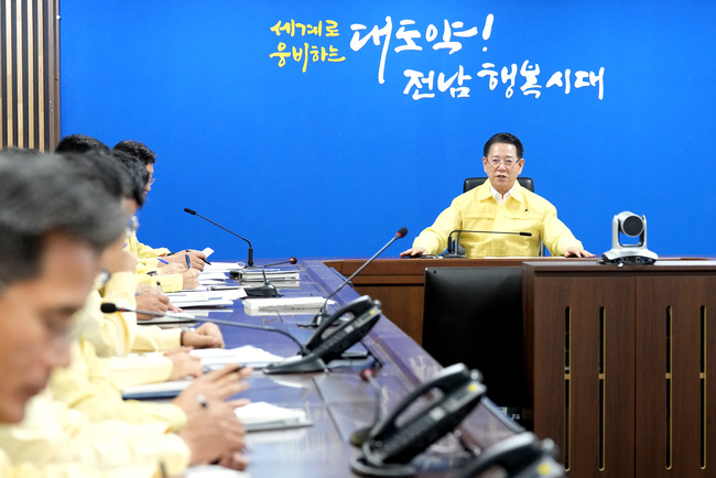 전라남도는 지난 13일 도청 재난종합상황실에서 긴급 집중호우 대처상황보고회를 주재하고 김영록 전라남도지사가 참석해 “산사태 우려지역, 야영장 등 현장 중심으로 과하다 싶을 정도로 대응해 단 한건의 인명피해도 없도록 하라”고 당부했다.