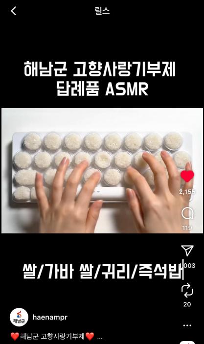 18일 해남군에 따르면 AI 기술을 활용해 제작한‘해남고향사랑기부제 답례품 ASMR’ 영상은 지난 9일 군 인스타그램 계정에 게재된 후 일주일만에 조회수 30만회를 돌파했다.
