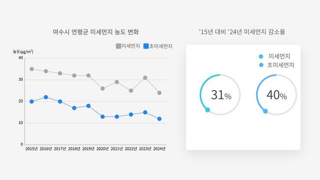 2024년 여수시의 연평균 미세먼지(PM-10) 농도는 24㎍/㎥, 초미세먼지(PM-2.5)는 12㎍/㎥로 최근 10년간 측정 이래 가장 낮은 수치를 기록했다. 이는 2015년 대비 각각 31.4%(35 → 24㎍/㎥), 40%(20 → 12㎍/㎥) 감소한 수치다.