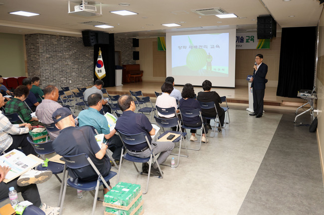 이번 교육은 농촌지역의 고령화와 인력난 해소를 위해 ▲양파 육묘의 기계화 소개 ▲병해충 예방과 방제 ▲양파 기계화 육묘 기술에 대한 선도농가 사례발표 및 질의응답 방식으로 진행됐다.