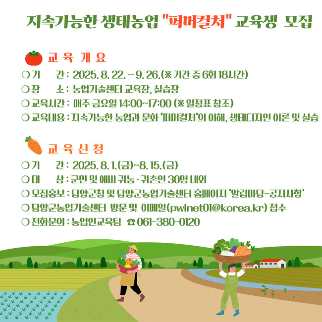 모집 대상은 담양군민과 예비 귀농·귀촌인으로, 8월 15일까지 선착순 30명을 모집한다. 신청은 농업기술센터를 직접 방문하거나 이메일(pwlnet01@korea.kr)로 접수하면 된다.