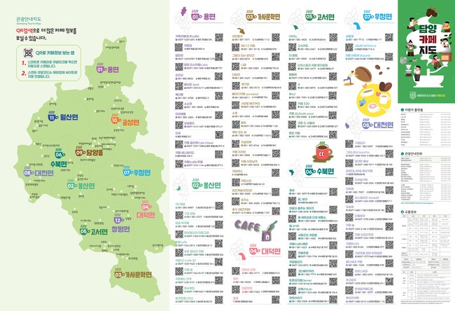 이번에 제작된 담양 카페지도는 읍·면별로 카페를 구분하고 상호명, 주소, 연락처 등 기본 정보를 한눈에 확인할 수 있도록 구성했다.