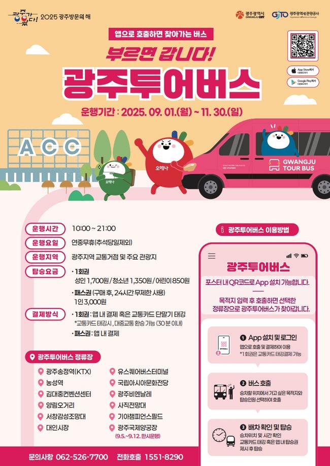 자세한 내용은 광주문화관광 오매광주 누리집(tour.gwangju.go.kr)과 광주관광공사 대표 누리집(www.gjto.or.kr)에서 확인할 수 있다. 광주투어버스 애플리케이션은 28일부터 애플 앱스토어와 구글 플레이스토어에서 내려받을 수 있다.